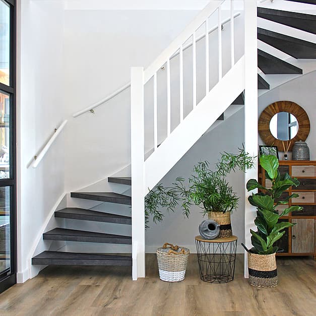 Renovatie/restyling van uw trap dmv overzettreden Grootste collectie aan materialen: • HPL Laminaat • PVC • PVC-Woven • Sense Touch • Eiken • PaintWood • Écht natuursteen • Italiaans runderleer - Handgesmeerd beton